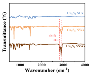 في طيف FT-IR لـ Cu9S5 SNWs كما هو موضح في الشكل 3، لوحظت ظاهرة تحول أحمر كبيرة مقارنةً بـ Cu9S5 NWs، مما يشير إلى التفاعل الإلكتروني بين Cu وS. يمكن أن تعزى القمم المميزة لعينات Cu9S5 NWs وCu9S5 SNWs عند 2916 سم-1 و2846 سم-1 إلى وضع الاهتزاز الممتد للميثيلين (- CH2-) في دوديكانيثيول، بينما تتوافق الذروة المميزة عند 1471 سم -1 مع وضع اهتزاز الانحناء لرابطة CH.