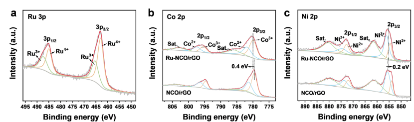 يمكن لتقنية XPS إجراء تحليل عميق للتركيبة العنصرية والحالات الكيميائية والبنية الإلكترونية لأسطح المحفز. عندما يتم تشعيع سطح المحفز بالأشعة السينية، يتم إثارة إلكترونات ذرات السطح. ومن خلال الكشف عن طاقة وكمية هذه الإلكترونات الضوئية، يمكننا تحديد نوع العنصر ومحتواه، وكذلك البيئة الكيميائية التي يتواجد فيها العنصر. على سبيل المثال، عند دراسة المحفزات المعدنية المدعومة، يمكن لـ XPS أن يحدد بدقة شكل المعدن على سطح الدعامة، سواء كان عنصرًا معدنيًا أو أكسيد فلز، والتغيرات في حالة الأكسدة الخاصة به. وهذا مهم جدًا لفهم آلية النشاط وإلغاء تنشيط المحفز. كما هو مبين في الشكل 5، تم استخدام XPS لإظهار التركيب وحالات التكافؤ لعناصر Ru وCo وNi. تم استخدام أطياف XPS الدقيقة لعناصر محددة في العينة لتحديد التحول الإيجابي/السلبي لطاقة الربط، مما يشير إلى وجود تفاعلات إلكترونية.