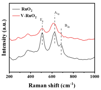 كما هو مبين في الشكل 4، فإن طيف رامان لـ V-RuO2 (V-doped RuO2) يتوافق مع طيف RuO2، مع عدم وجود قمم فريدة أخرى، باستثناء توليد V2O5. يؤدي تعاطي المنشطات V إلى تحويل وضع A1g لـ RuO2 إلى أرقام موجية أقل، مما يشير إلى أن إدخال V يؤثر بشكل كبير على هيكل الشبكة وبيئة الترابط الكيميائي (مما قد يؤدي إلى وجود شواغر في الأكسجين أو عيوب محلية)، وبالتالي تغيير هيكلها الإلكتروني؛ يعكس التحول الأيسر لذروة A1g التفاعل بين ذرات V وشبكة RuO2، مما يشير إلى أن المنشطات V تعدل التماثل المحلي وخصائص طول الرابطة لـ RuO2.